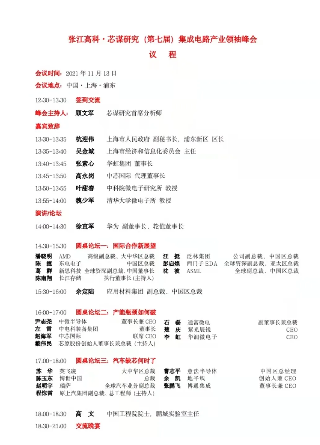 11月13日,由芯謀研究首席分析師顧文軍主持,張江高科、全球領先的半導體產業智庫芯謀研究、上海集成電路產業集群發展促進機構聯合舉辦的,“張江高科·芯謀研究(第七屆)集成電路產業領袖峰會”在上海浦東召開。上海市委常委,浦東新區區委書記朱芝松;上海市人民政府副秘書長,浦東新區區長杭迎偉;上海市經濟和信息化委員會主任吳金城;華為副董事長、輪值董事長徐直軍;華虹集團董事長張素心;中芯國際代理董事長高永崗;中科院微電子研究所教授葉甜春;清華大學微電子所教授魏少軍;中國工程院院士、鵬程實驗室主任高文;中國科學院院士劉明;中國工程院院士吳漢明;長鑫存儲黨委書記常務副總經理王厚亮;深圳證券交易所副總經理李輝;廣發基金管理有限公司黨委書記葛長偉;應用材料集團副總裁、中國區總裁余定陸等二百多位政府領導、院士專家、半導體企業領袖和投資家齊聚芯謀峰會,圍繞“風雨同芯,攜手共進”的主題,共商全新形勢下半導體產業發展大計。