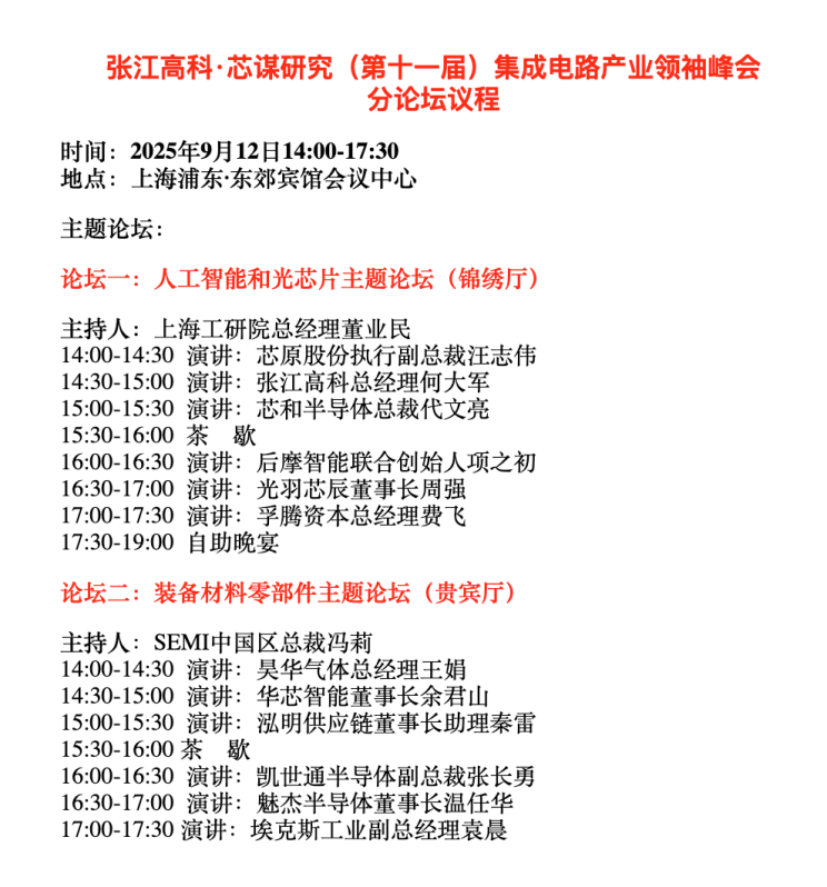 出席企業:高通、飛書、中安、研微、泓明供應鏈曦智科技、微崇、普達特、日月光、應用材料、安集、壁仞、鼎龍控股、勝科納米、矽睿、芯慧聯芯、芯耀輝、盛合晶微、全芯智造、亞舍利、博康、華宇、孚騰資本、LAM、芯勢科技、盛劍科技、TEL中國區、華天科技、長晶科技、西恩迪超駿、朗迅科技、CADENCEKLA、艾森、魁杰半導體、盛世投資、上創新微、力芯微、奧芯明、博世、科意、新微、增芯。